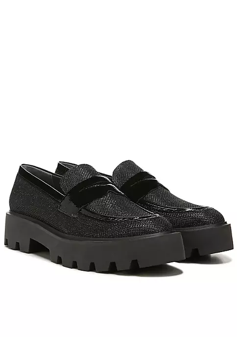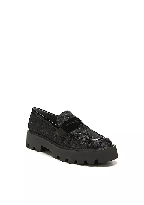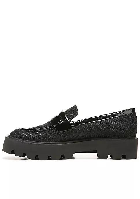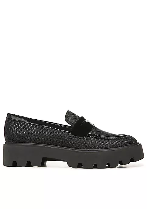 A sport-chic loafer with a substantial lug sole and an amazingly comfortable feel. Crinkle patent upper, fabric, or faux leather upper partially made from recycled materials. Eco-conscious linings with soft + sustainable comfort. Extra cushioning with a cupped footbed and flexible fit for all-day wear. Slip-on fit for easy on/off. Round toe. Penny keeper strap. 1.57 inch platform heel with lug sole.
