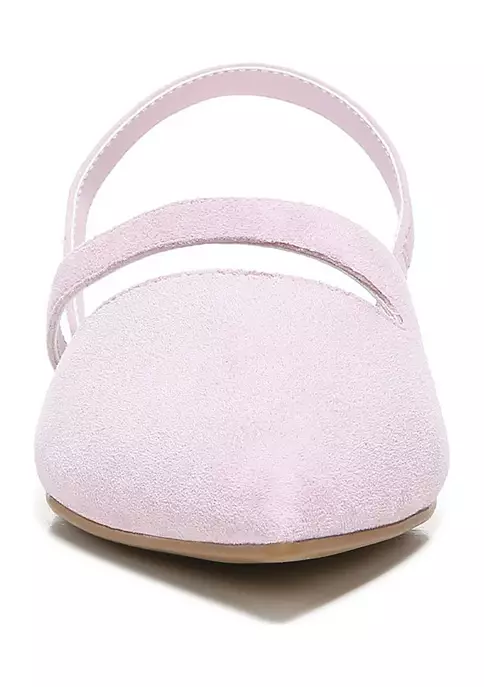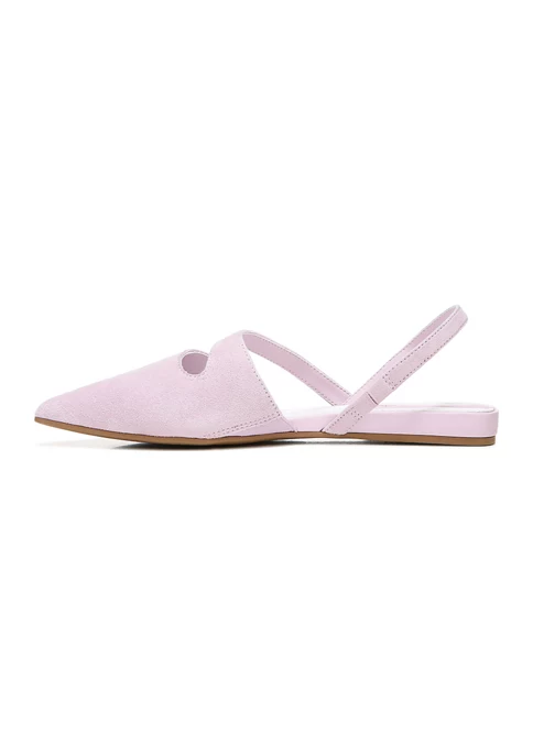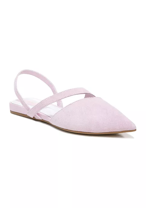A chic pointed-toe flat in essential shades of the season. Leather or suede upper. Eco-conscious linings with soft + sustainable comfort. InFORMA comfort technology: Ergonomic insoles, contoured padding at key pressure points, and exceptional support . Slip-on fit with back heel strap. Pointed toe. Asymmetrical strap detail. 0.5 inch heel.