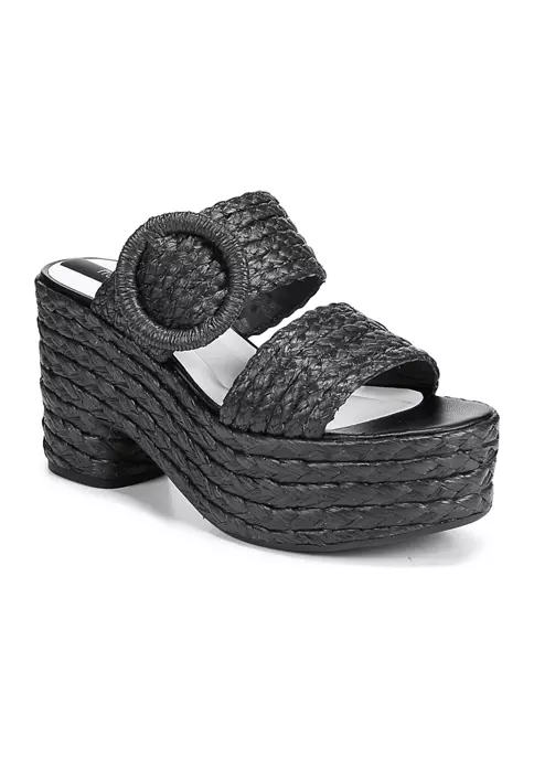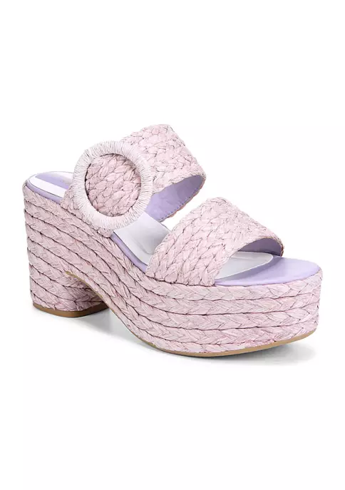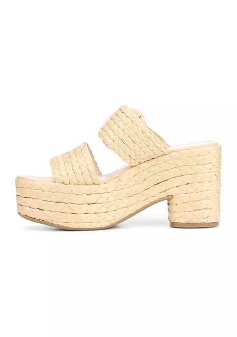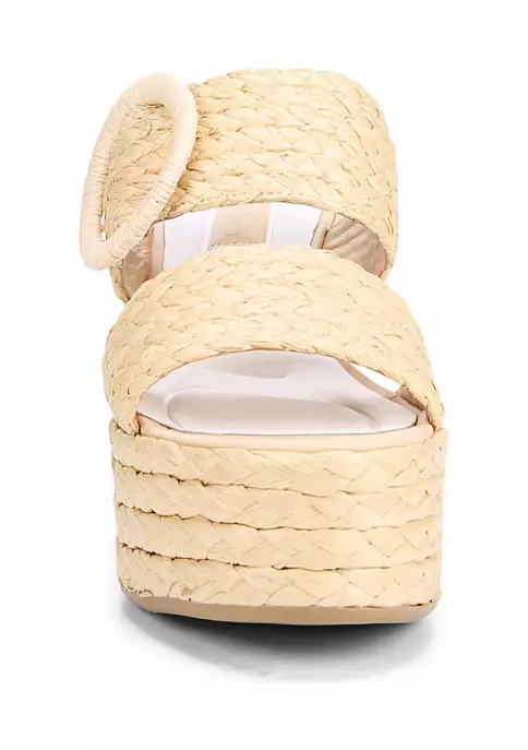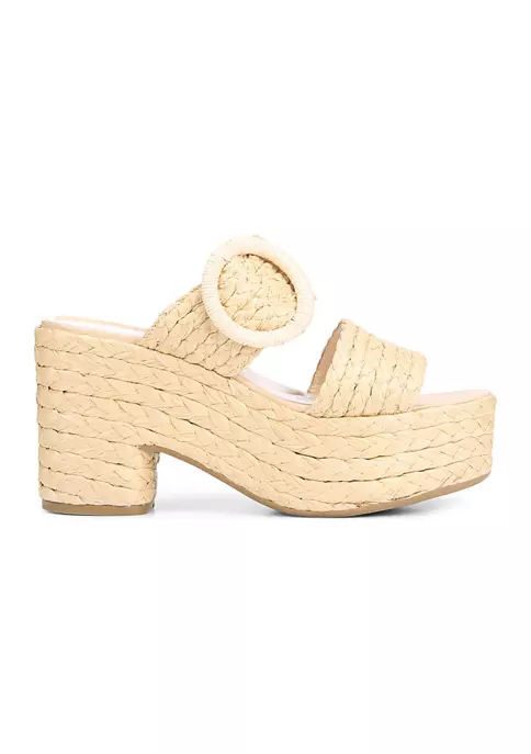 Make a stunning statement in this vintage-inspired, eye-catching platform sandal wrapped in braided raffia. Natural raffia upper. Eco-conscious linings with soft + sustainable comfort. InFORMA comfort technology: Ergonomic insoles, contoured padding at key pressure points, and exceptional support. Slip-on fit. Open round toe. Decorative ring detail. 4 inch block heel, 2 inch platform.