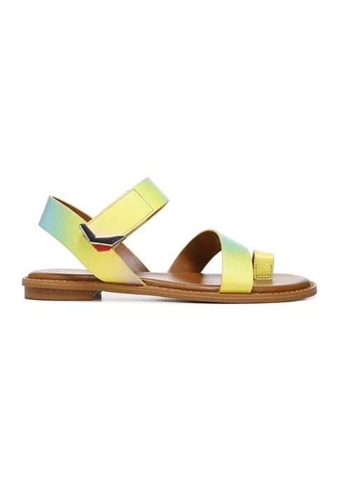 Minimal and modern design at its best. This strappy flat sandal is the epitome of effortless style. Leather upper. Eco-conscious linings with soft + sustainable comfort. Padded footbed. Instep strap with adjustable hook-and-loop closure. Open round toe with toe ring detail. 0.5 inch heel.
