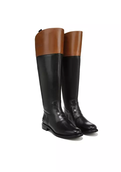 with two-toned styling. Hand-finished leather makes this artisan-inspired style one-of-a-kind. Eco-conscious linings with soft + sustainable comfort. Back zip for easy on/off. Almond toe. Seaming details and pull tab. 14.65 inch shaft height, 16.61 inch circumference. 1 inch heel.