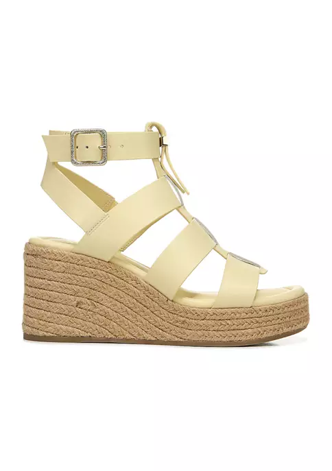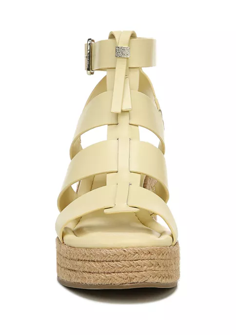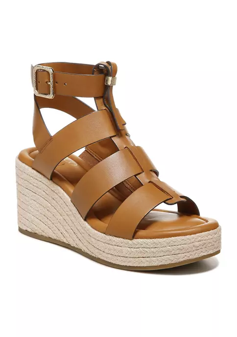 The art of the wedge sandal. This stunning, gladiator-inspired espadrille wedge sandal is an essential all season long. Leather or faux leather upper partially made from recycled materials. Eco-conscious linings with soft + sustainable comfort. Ankle strap with adjustable buckle. Open round toe. Espadrille style with jute-wrapped wedge. 3.14 inch wedge heel, 1.38 inch platform.
