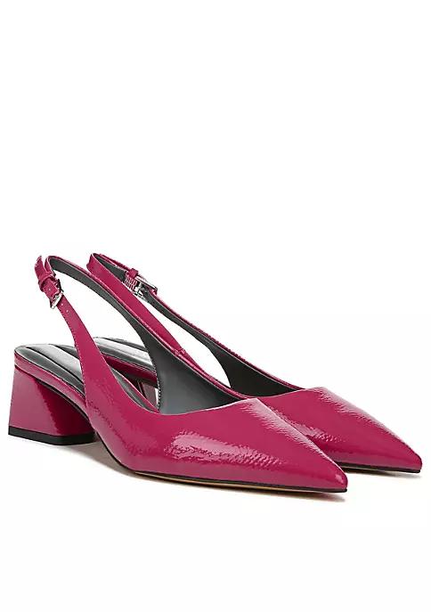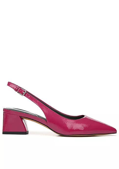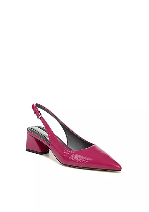 Set on a modern and angular block heel, this pointed toe slingback pump exudes feminine allure. Leather, suede, patent, fabric, or faux leather upper partially made from recycled materials. Eco-conscious linings with soft + sustainable comfort. InFORMA comfort technology: Ergonomic insoles, contoured padding at key pressure points, and exceptional support. Heel sling strap with adjustable buckle closure. Pointed toe. 2.17 inch wrapped block heel.