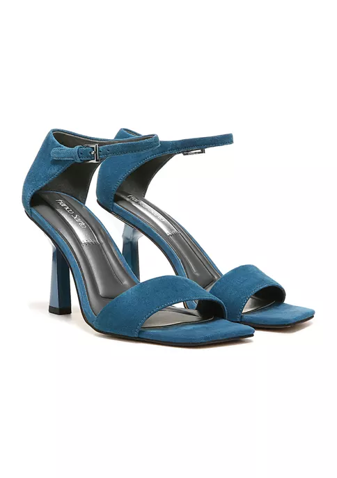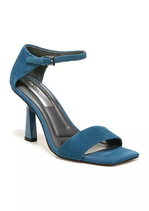 Sleek and refined, everything about this heeled dress sandal is perfection. Suede or leather upper. Eco-conscious linings with soft + sustainable comfort. InFORMA comfort technology: Ergonomic insoles, contoured padding at key pressure points, and exceptional support. Ankle strap with adjustable buckle. Square toe. 3.5 inch sculptural heel with shiny accent.