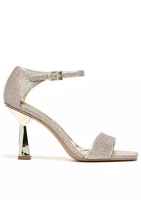 Sleek and refined, everything about this textured dress sandal is perfection. Fabric upper. Eco-conscious linings with soft + sustainable comfort. InFORMA comfort technology: Ergonomic insoles, contoured padding at key pressure points, and exceptional support. Ankle strap with adjustable buckle. Square toe. 3.5 inch sculptural heel with shiny accent.