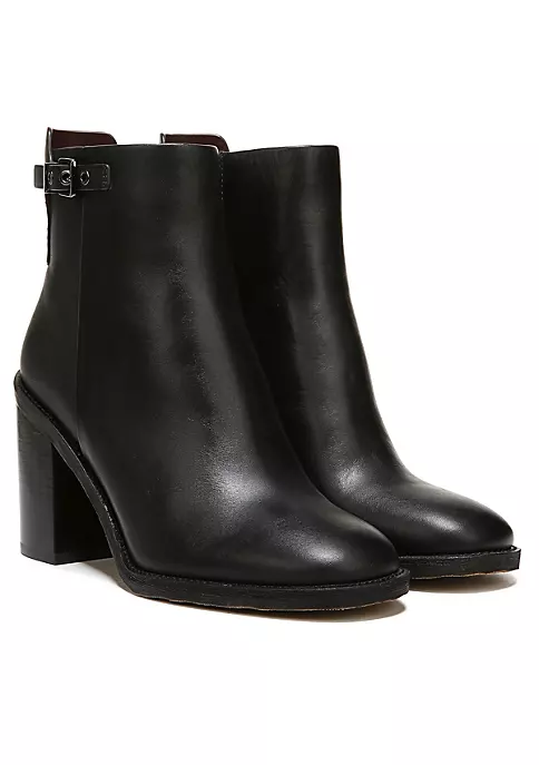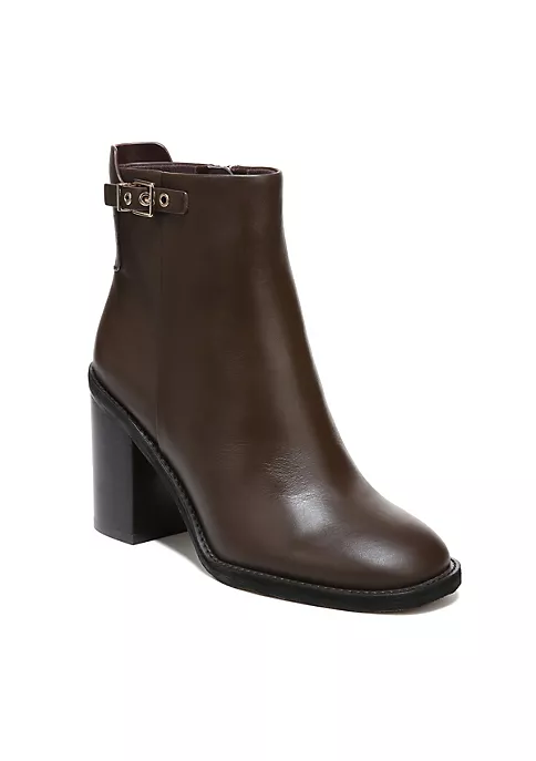 A classic ankle bootie made luxe by sleek details. Leather upper. Eco-conscious linings with soft + sustainable comfort. Side zip for easy on/off. Metallic buckle detail. Almond toe. 4.65 inch shaft height, 10.83 inch circumference. 3.35 inch sculpted heel.